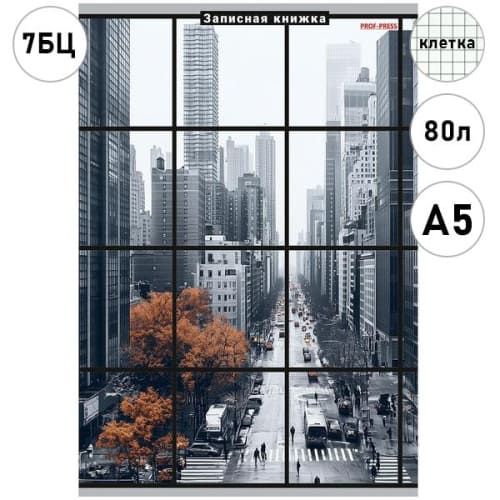 Записная книжка А5 7БЦ 80л " Проф-Пресс " Мегаполис в окне, клетка, обложка - глянцевый ламинированный картон, сшивка