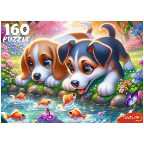 Пазлы " Рыжий кот " 160элементов Щенки и рыбки 33*23см, картонная упаковка 25,4*15,3*12,8см
