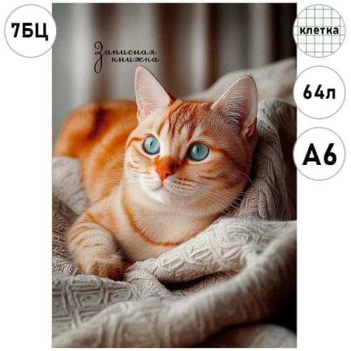 Записная книжка МАЛЫЙ ФОРМАТ А6 7БЦ 64л " Проф-Пресс " Фото котика-2, клетка, обложка - глянцевый ламинированный картон, сшивка, офсет