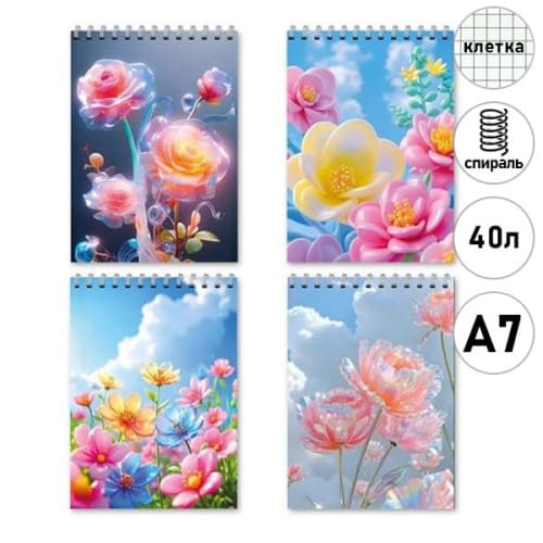 Блокнот МАЛЫЙ ФОРМАТ А7 спираль 40л " Mazari " Цветы, клетка, офсет, обложка - картон, ассорти 4 дизайна
