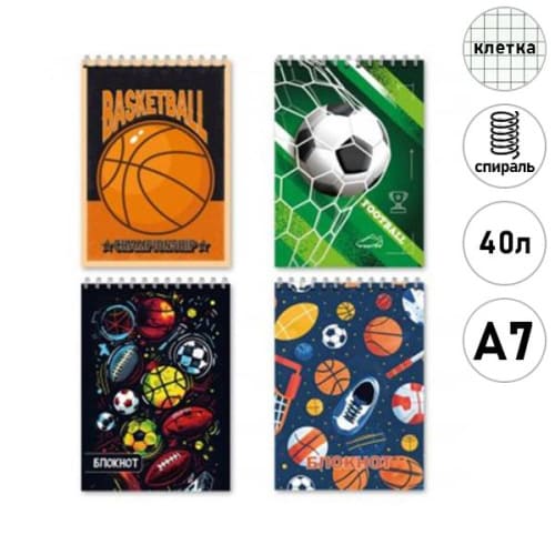 Блокнот МАЛЫЙ ФОРМАТ А7 спираль 40л " Mazari " Мячи клетка, офсет, обложка - картон, ассорти 4 дизайна