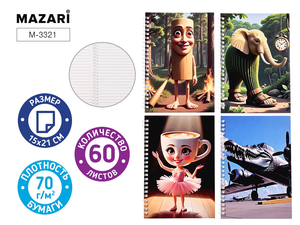 Блокнот А5 спираль 60л " Mazari " Итальянские мемы, клетка, офсет, обложка - картон, ассорти, 4 дизайна