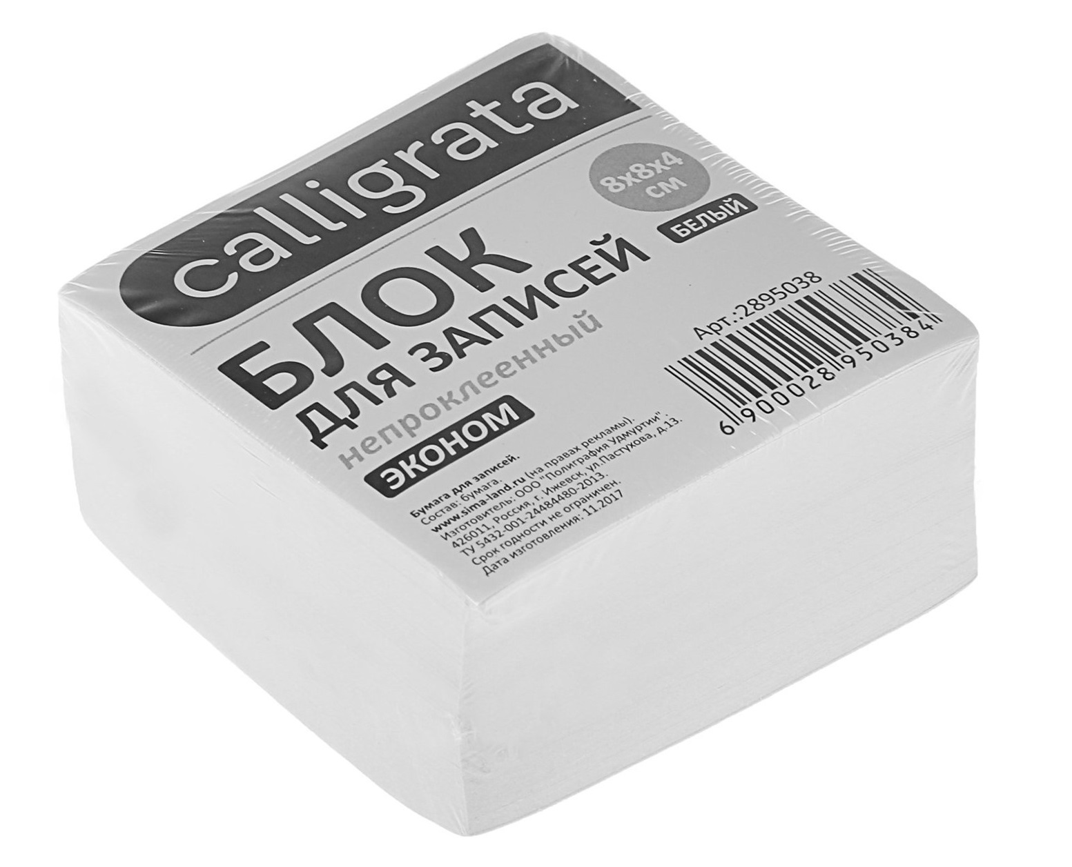 Блок бумаги д/записей 8*8*4 Calligrata белый 55г/м2 белиз 70-80% 2895038