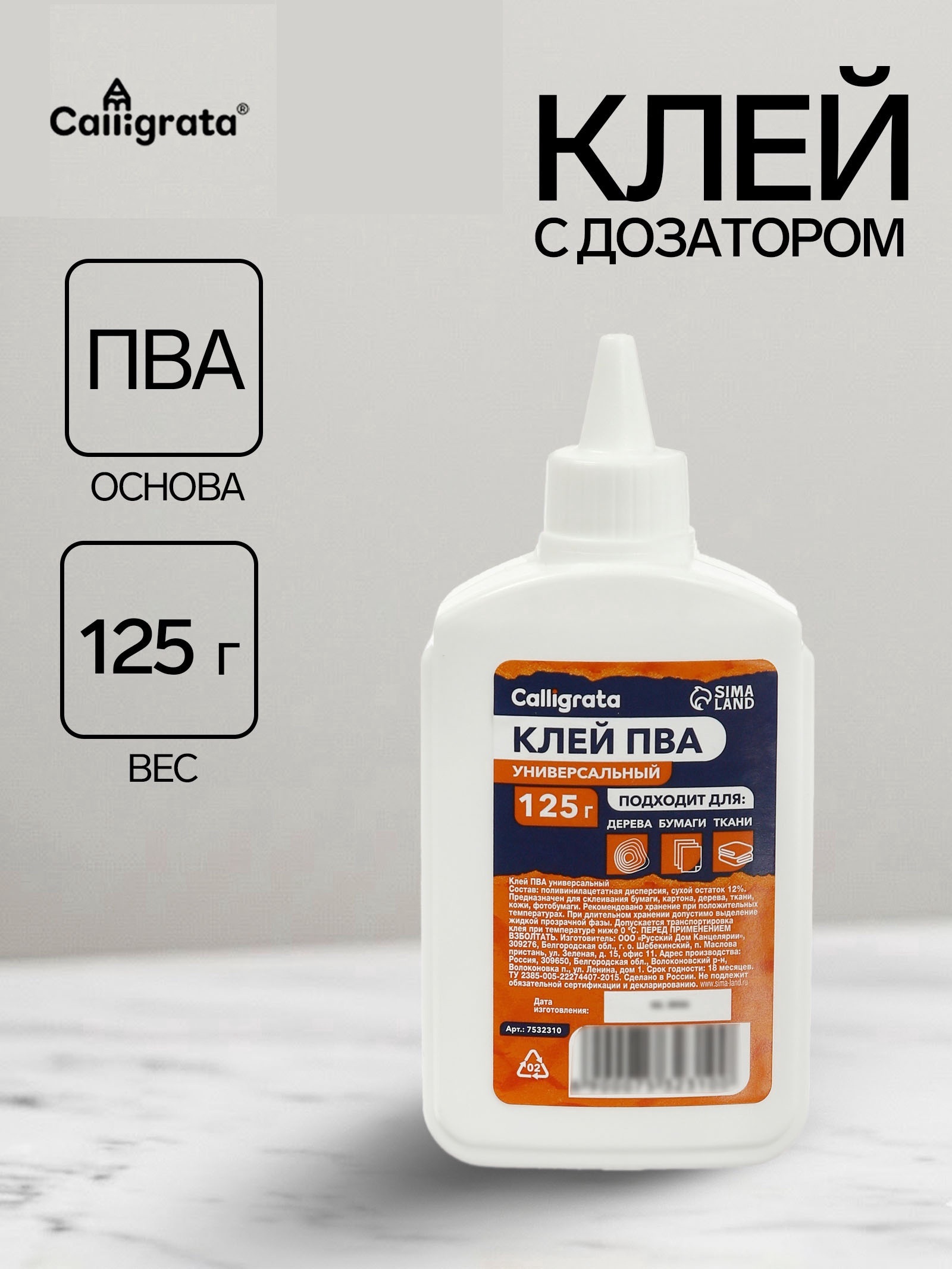 Клей ПВА 125г Calligrata, с дозатором 7532310