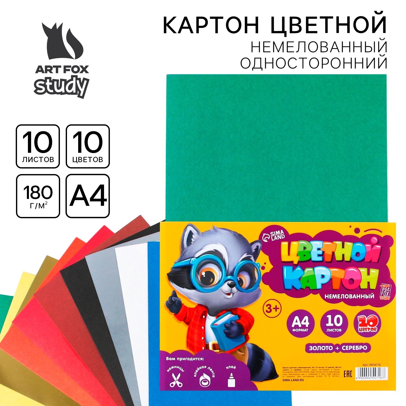 Картон цветной А4 10л 10 цв немелованный 180г золото+серебро в плёнке "Енотик" 9454716