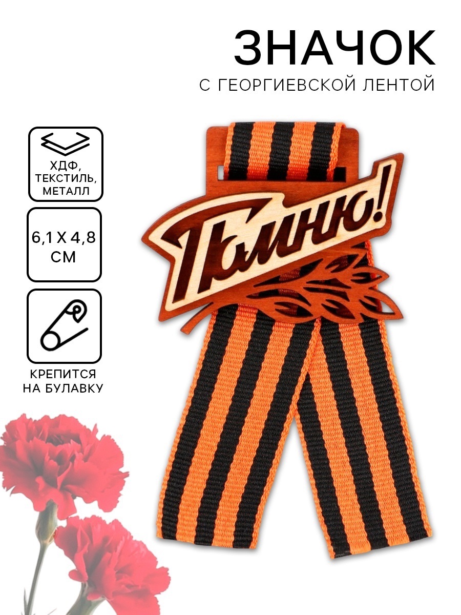 Значок деревянный с лентой "Помню!", 6,1 х 4,8 см, георгиевская лента 9499747