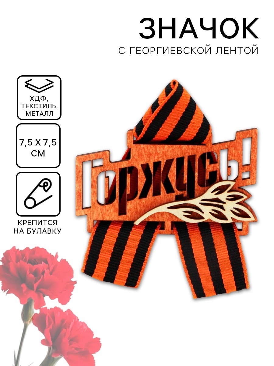 Значок деревянный с лентой "Горжусь" георгиевская лента 10297219
