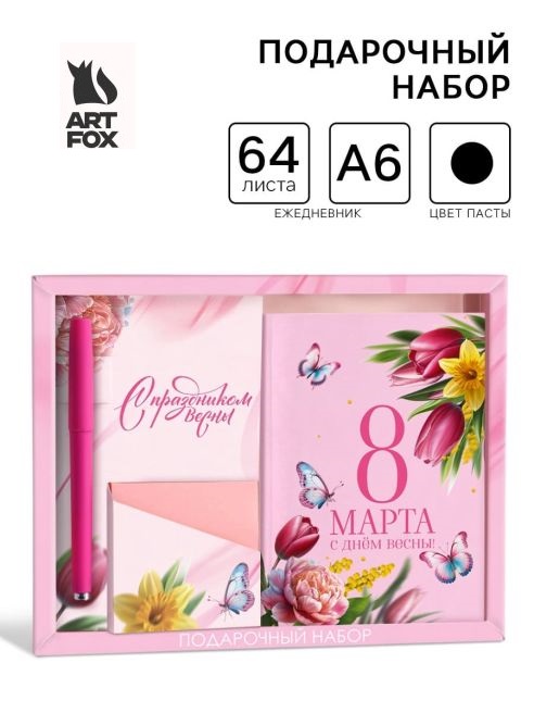 Подарочный набор: ежедневник А6, блок с липким слоем, ручка "8 марта. С днём весны!" 10645235