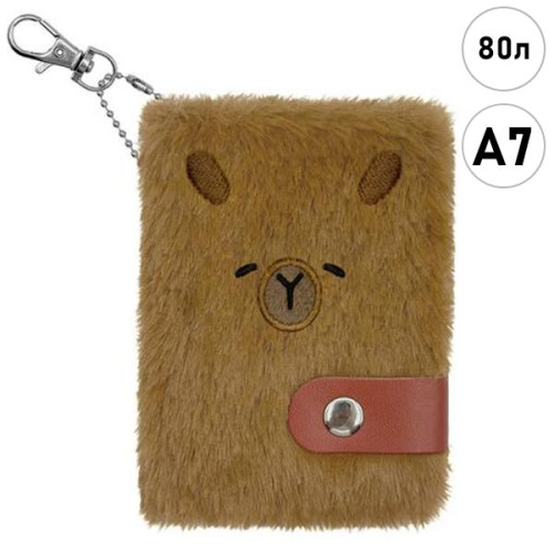 Блокнот на кнопке МАЛЫЙ ФОРМАТ А7 искусственный мех 80л " KWELT " Капибара, без линовки, сшивка, тонированный офсет, брелок, 7*10см