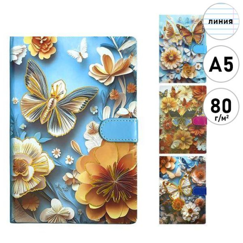 Блокнот А5 76л " KWELT " Butterfly, ассорти (без возможности выбора дизайна), линия, склейка, обложка- ламинированный картон, тонированный офсет 80г/м2, на магнитной кнопке, 140*210мм