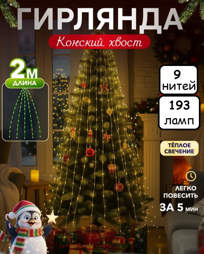 Гирлянда электрическая "Конский хвост" 193лампы 10выходов высота 2м желтая OMAKS P-113 в картонной упаковке