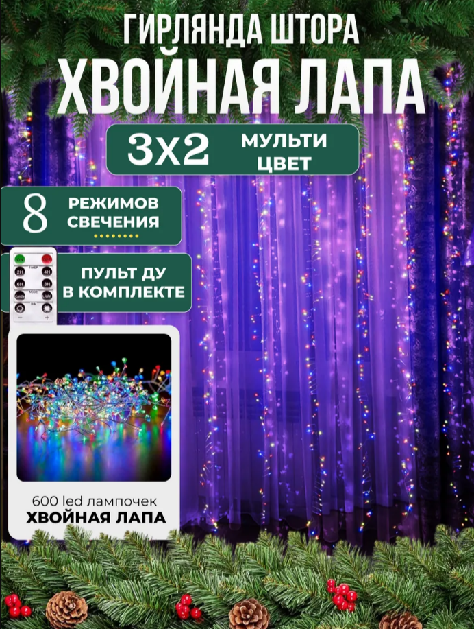 Гирлянда-штора электрическая "Роса Хвойная лапа" 3х2м мульти цвет с пультом OMAKS P-181 в коробке