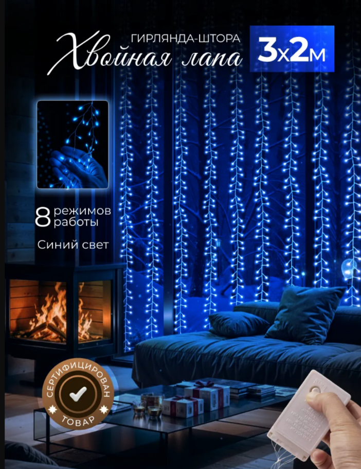 Гирлянда-штора электрическая "Роса Хвойная лапа" 3х2м синий цвет с пультом OMAKS P-181 в коробке