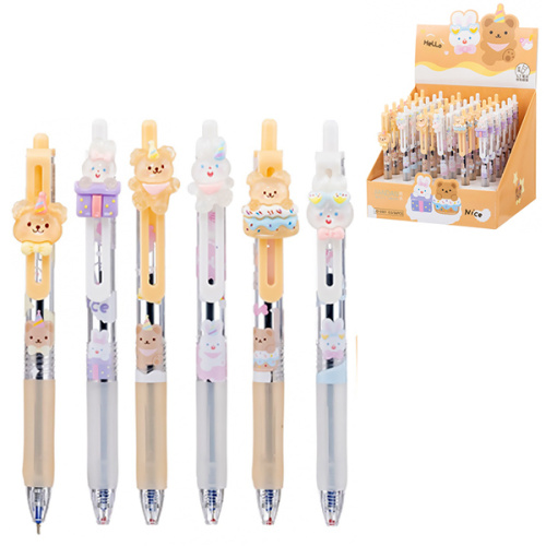 Ручка шариковая автоматическая " Basir " Зайчик мишка, синяя, 0,5мм, резиновый держатель, цветной корпус с рисунком, ассорти, клип с насадкой - зайчик, мишка, картонный дисплей