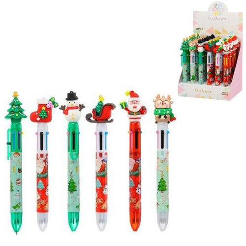 Ручка шариковая автоматическая " Basir " Новогодняя, 6цв, 0,5мм, прорезиненный наконечник-Дед Мороз, елка, олень, снеговик, сапог, сани, цветной корпус, ассорти