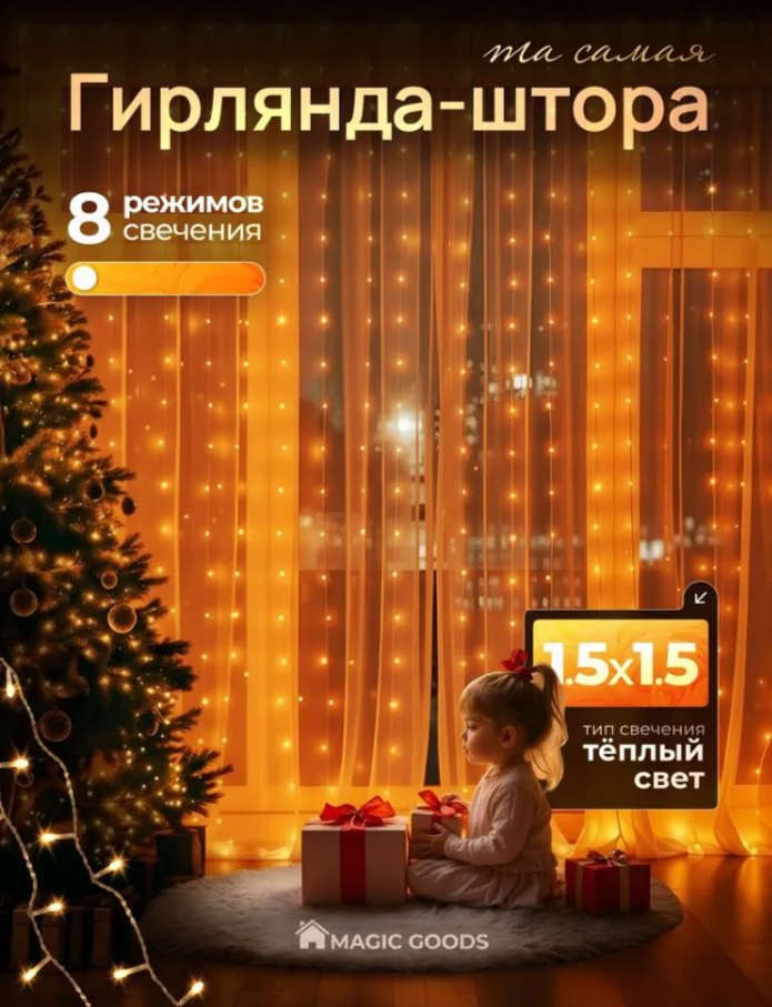 Гирлянда-штора электрическая "Роса" 1,5х1,5м желтый цвет с пультом OMAKS P-189 в коробке