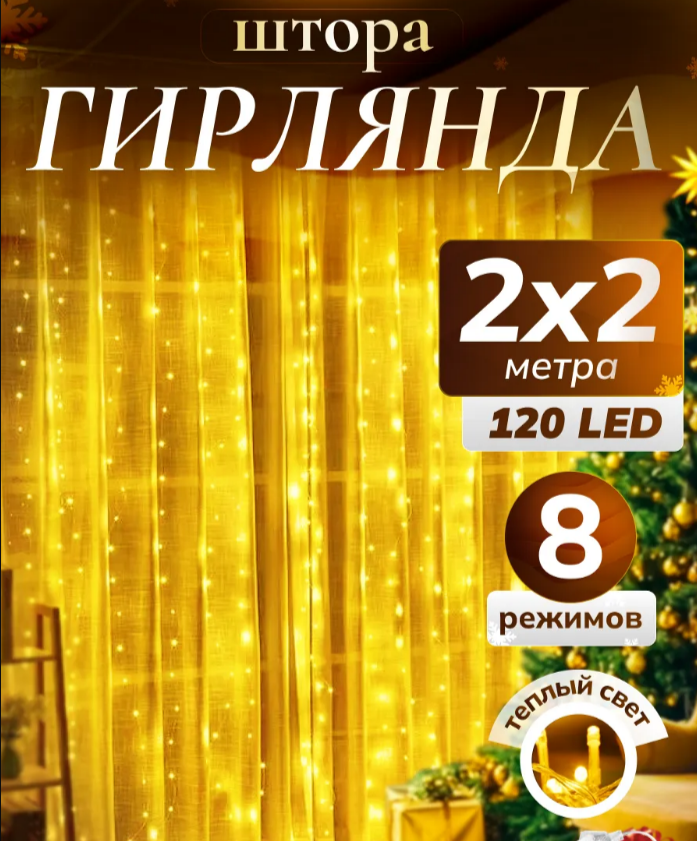 Гирлянда-штора электрическая "Роса" 2х2м желтый цвет с пультом OMAKS P-190 в коробке