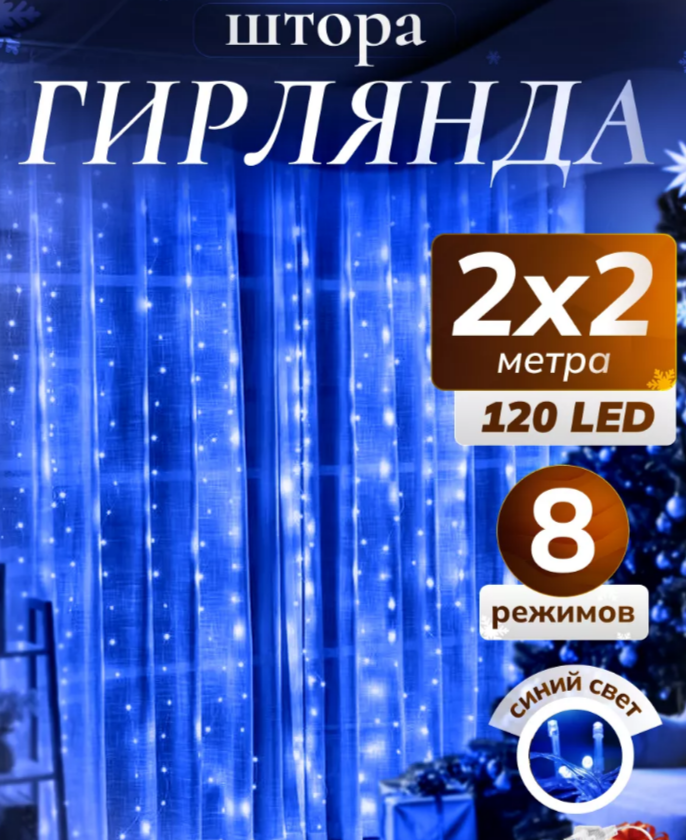 Гирлянда-штора электрическая "Роса" 2х2м синий цвет с пультом OMAKS P-190 в коробке