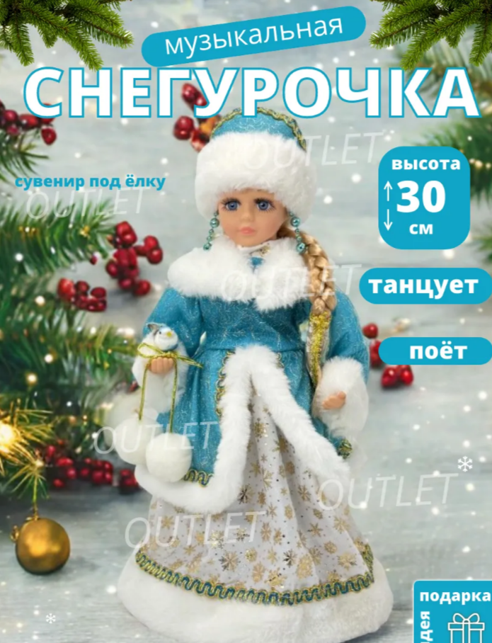 Снегурочка электрическая 310мм бирюзовая одежда танцует и поет песенку OMAKS DB78-12 в картонной упаковк