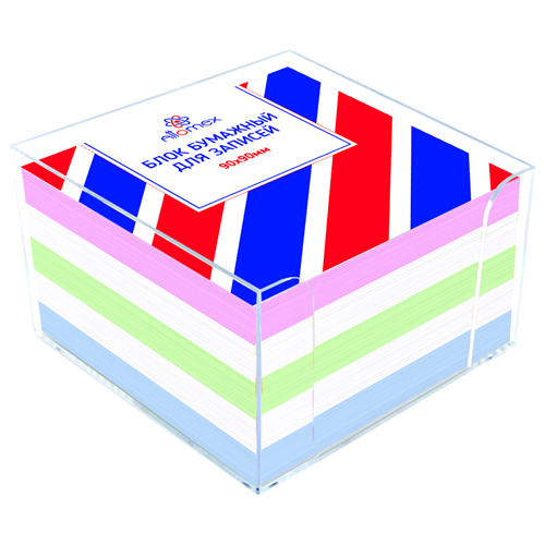 Блок бумаги " Attomex " 9*9*5см 4 цвета (зеленый, белый, розовый, голубой), в прозрачной пластиковой подставке, непроклеенный, плотность 65 г/м, 90% белизна